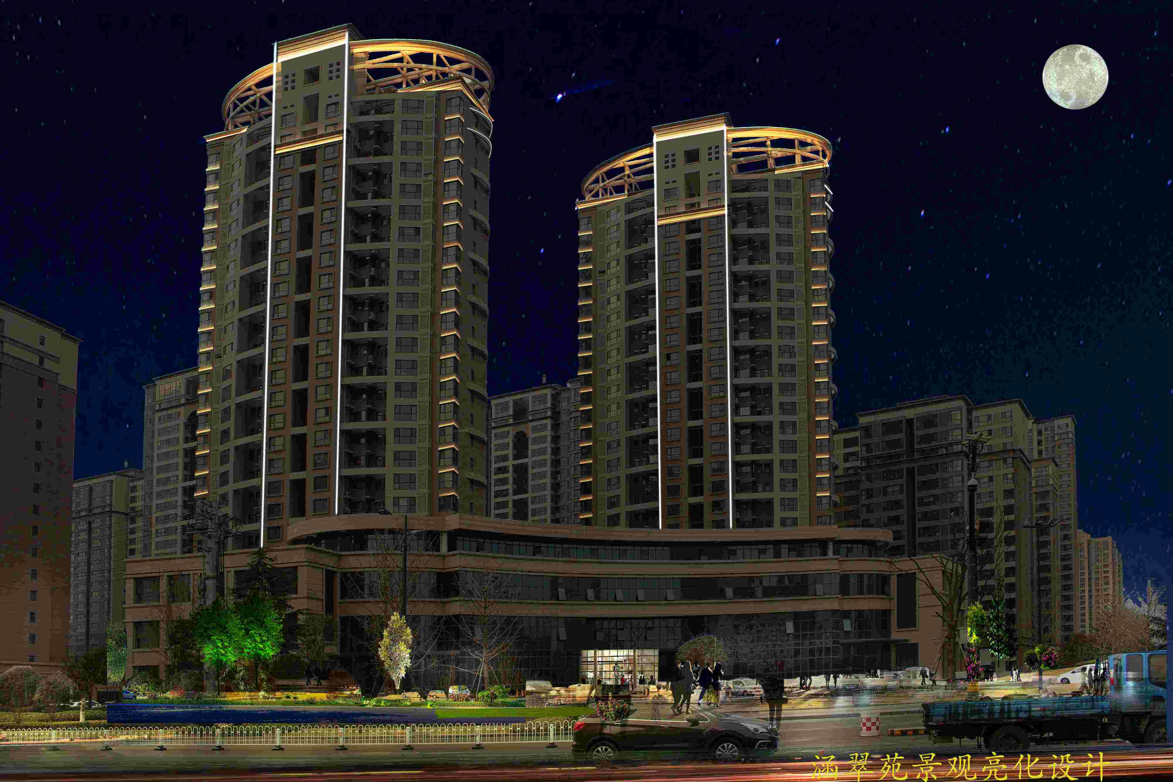 整體風格簡潔、大方,光色上以黃光為主,暖白色為輔,線條簡潔明了,突出建筑物整體布局結構。